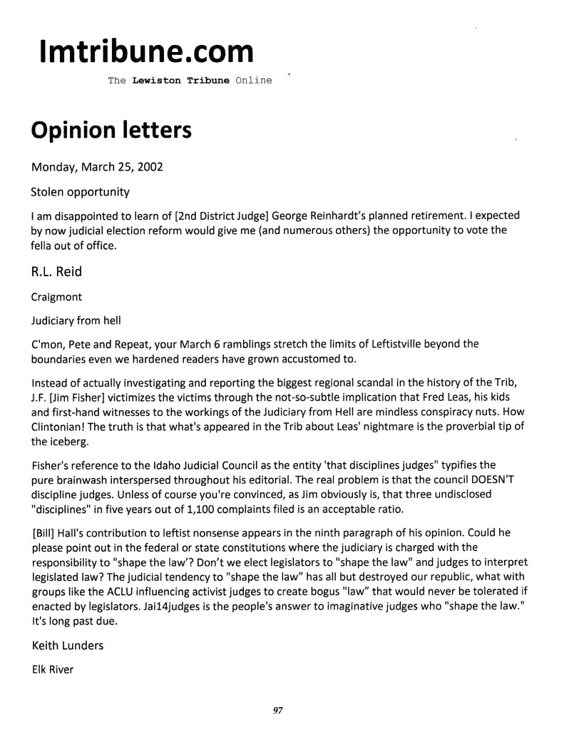 >>>>>January 15, 1998: A report of Mr. Fred L. Leas and the Latah Co. Legal System