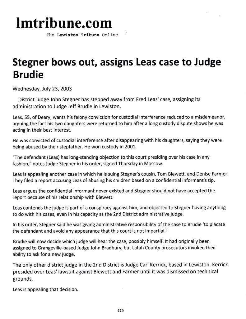 July 23, 2003: Stegner bows out, assigns Leas case to Judge Brudie