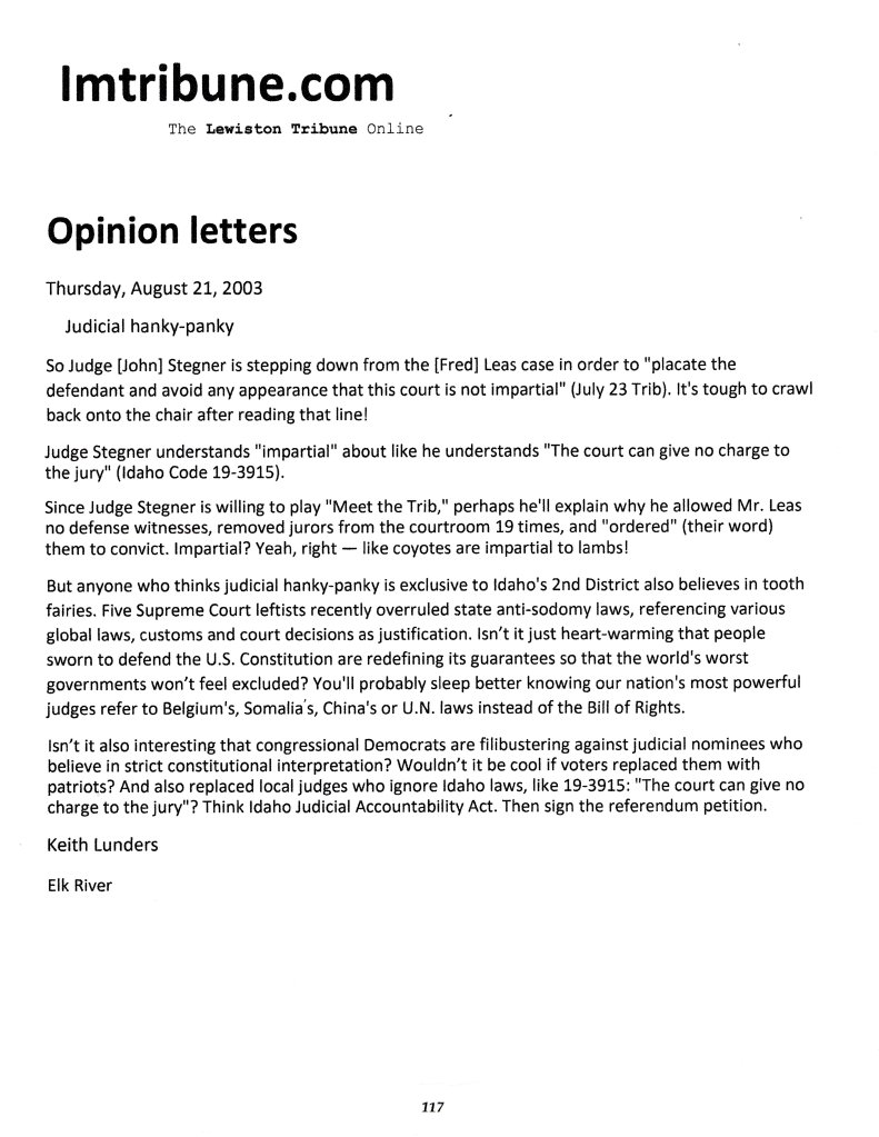 June 05, 2003: Leas takes case to Idaho Supreme Court