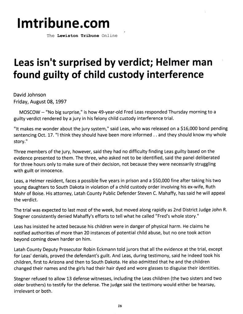 >>>>>January 15, 1998: A report of Mr. Fred L. Leas and the Latah Co. Legal System