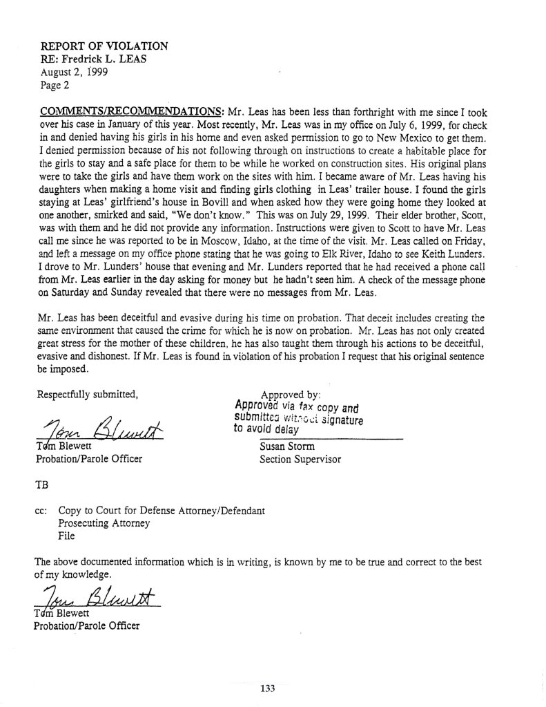 August 09: 1999: Special Progress Report (accused of molesting daughters.)