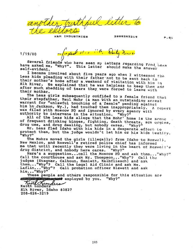 September 24, 1999: History of Fred Leas and the Latah Co. Legal System