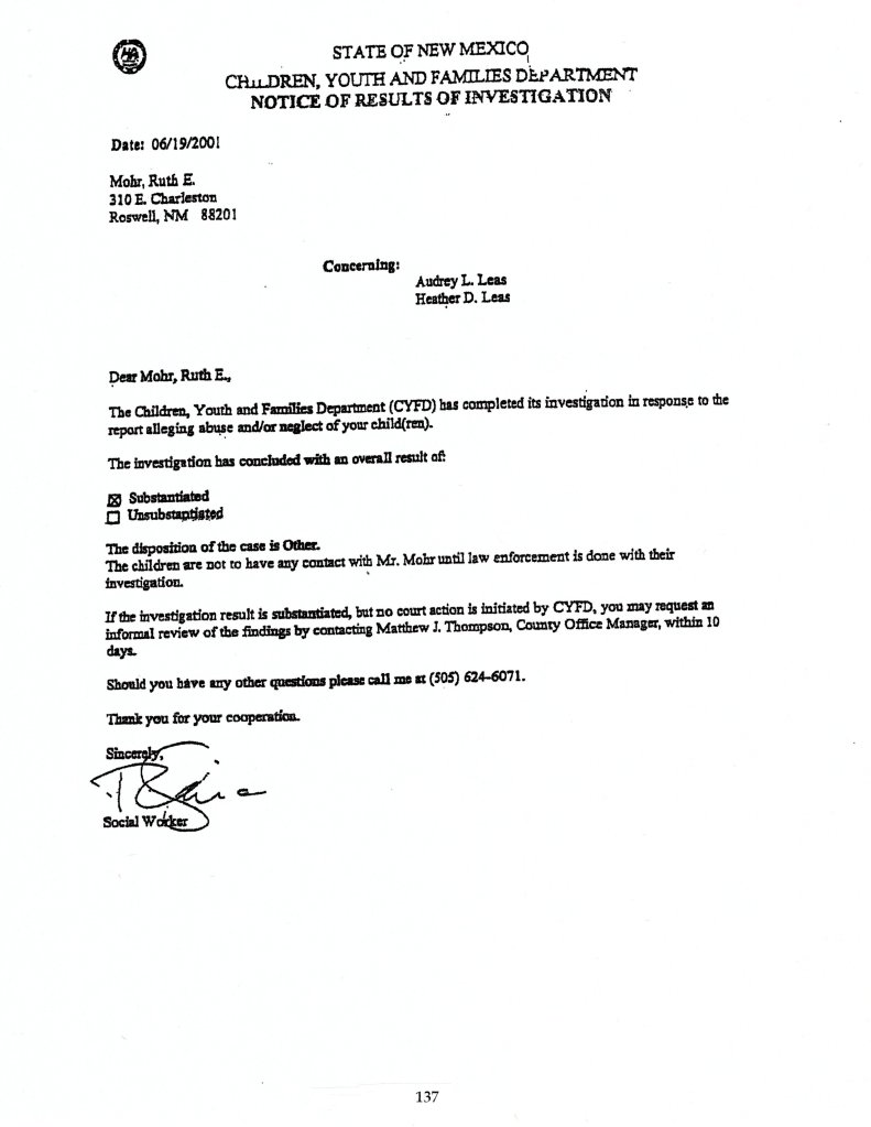 June 19, 2001: State of New Mexico Notice of Results of Investigation